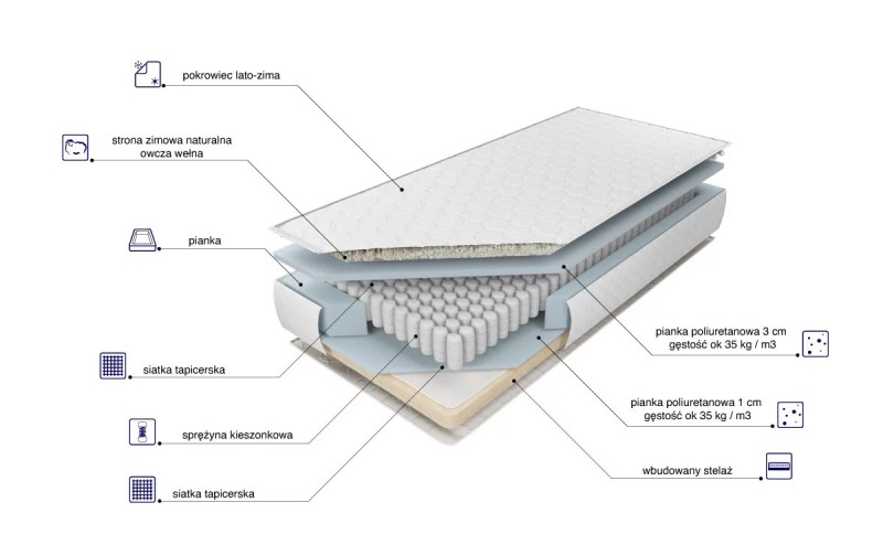 Wkład sprężynowy obłożony jest z jednej strony przekładką tapicerską, a z drugiej siatką tapicerską i pianką poliuretanową T35 o zwiększonej sprężystości i grubości 30 mm. Materac w pokrowcu Lato zawiera dodatkowo końskie włosie, posiadające właściwości usztywniające, a przede wszystkim zwiekszające przewiewność.